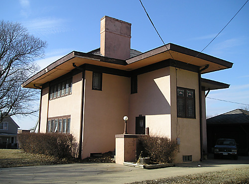 A stucco cube with side entrance based on Wright’s Fireproof House for $5000. Of considerable interest for the fidelity, at least on the exterior, to Wrightian ideals, its distance from centers of Prairie School architecture, and the enigma of its authorship. Note the flat eaves with built-in gutters, and the non-Wright-approved location of the chimney mass.
